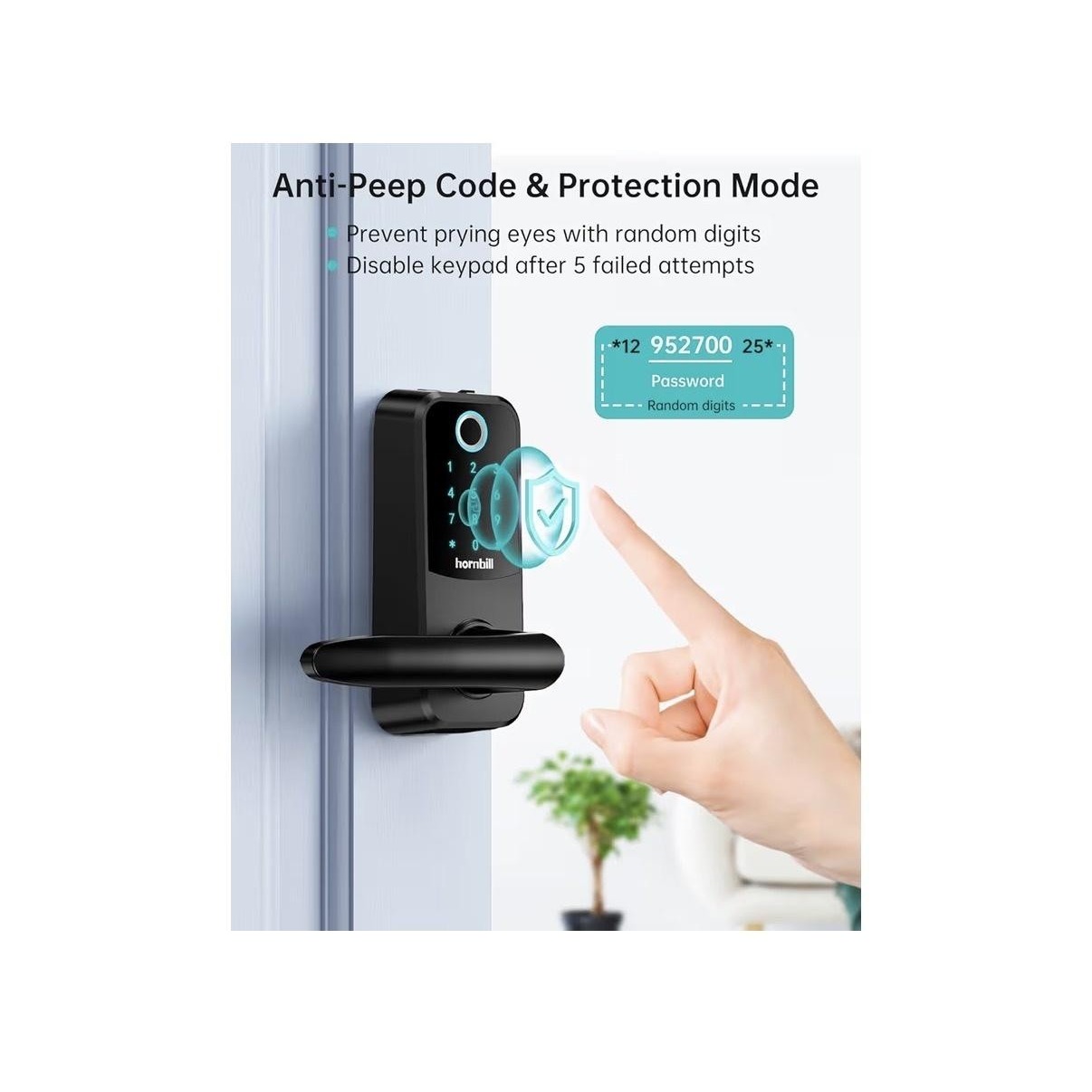 Keypad with anti-peep entry (add random digits); protection mode after 5 failed attempts