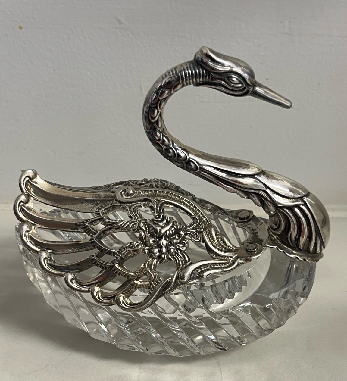 Jugendstil Era German Cut Crystal Art Glass & 800/1000 Silver Open Salt Swan Group Circa 1890-1910